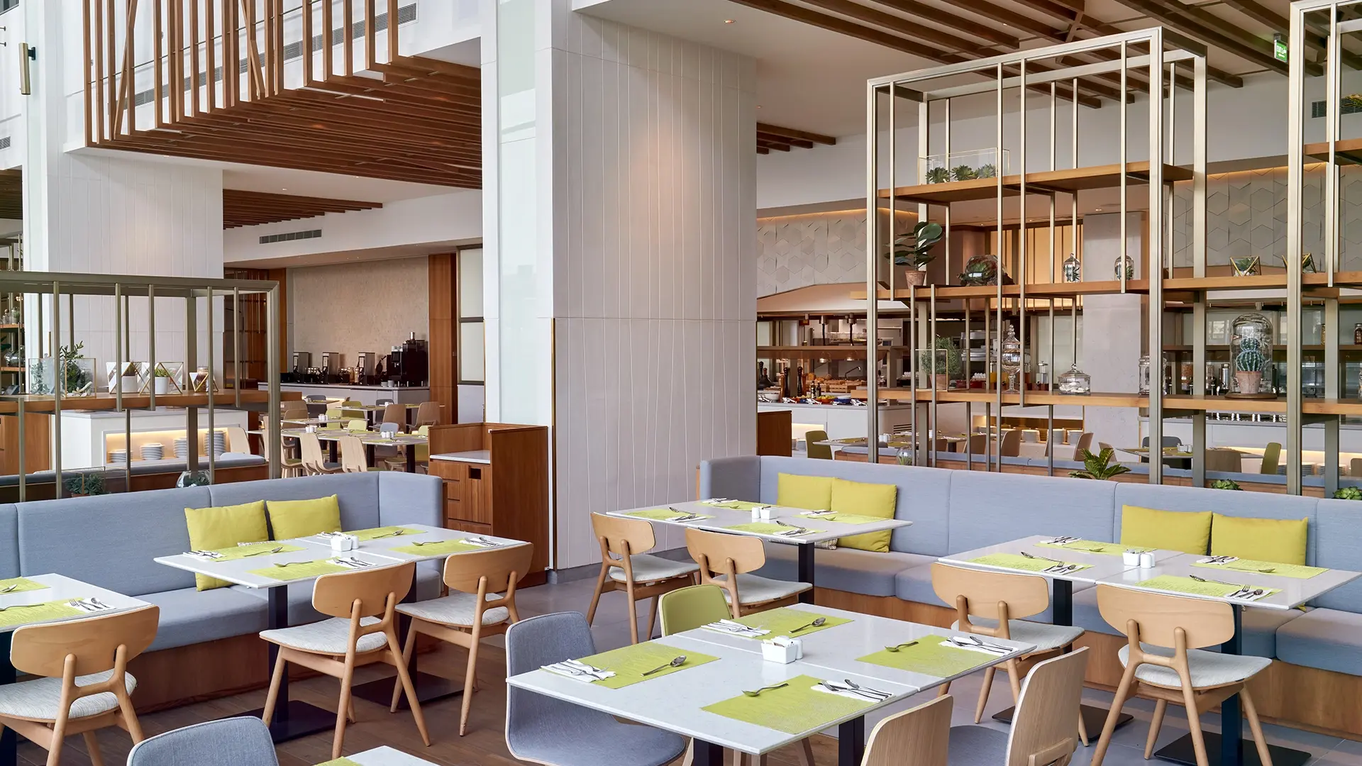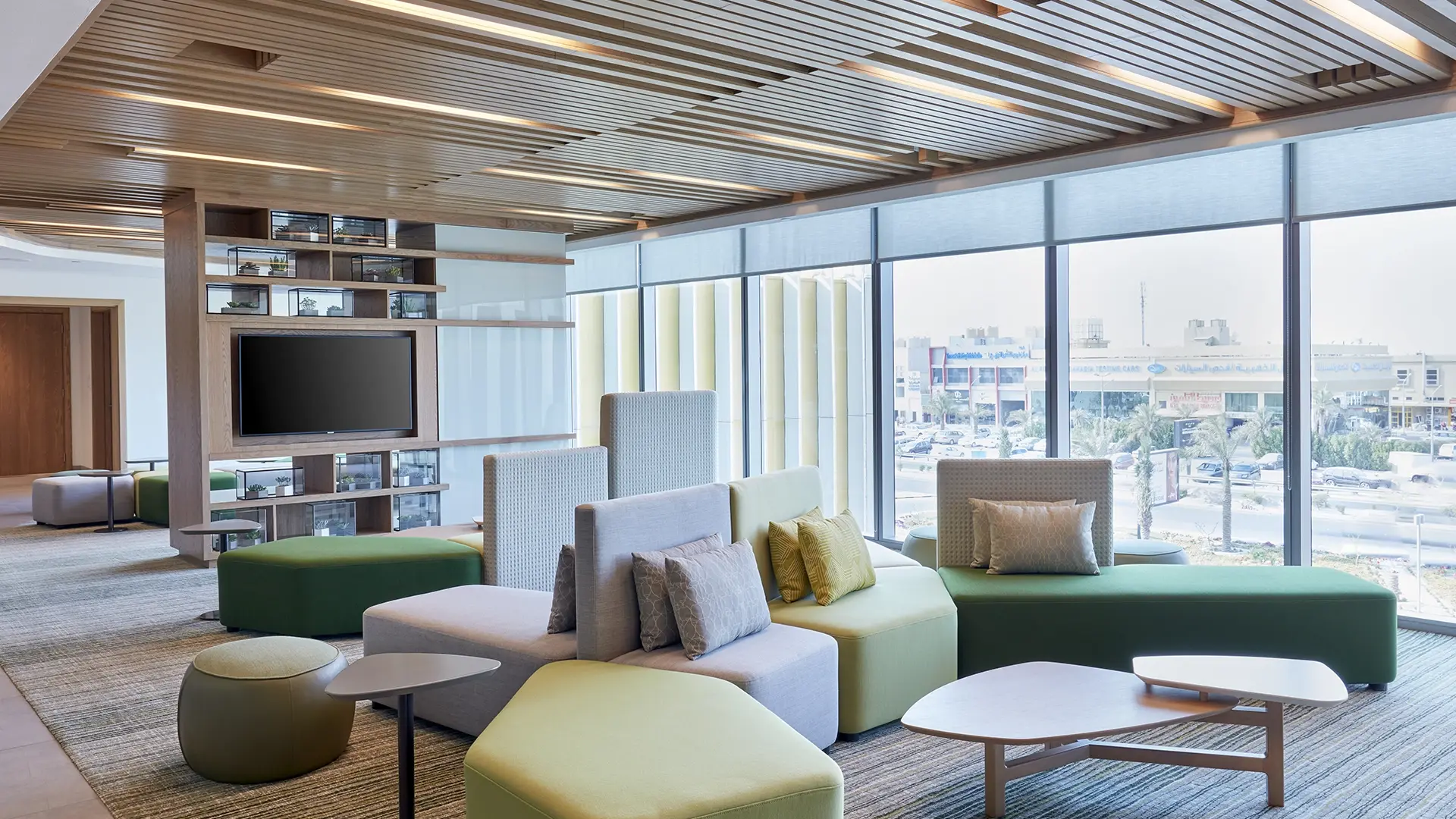 Our local fit-out team provided the finishing works, including regular and acoustic ceilings, corridor wall cladding, painting, screeding, wallpapers, tiling, carpets, glass and movable partition works. Our joinery in Bahrain manufactured the ceiling panelling, a pattern that is repeated across different public areas, as well as the juice bar counters, banquet seating and guest room millworks.