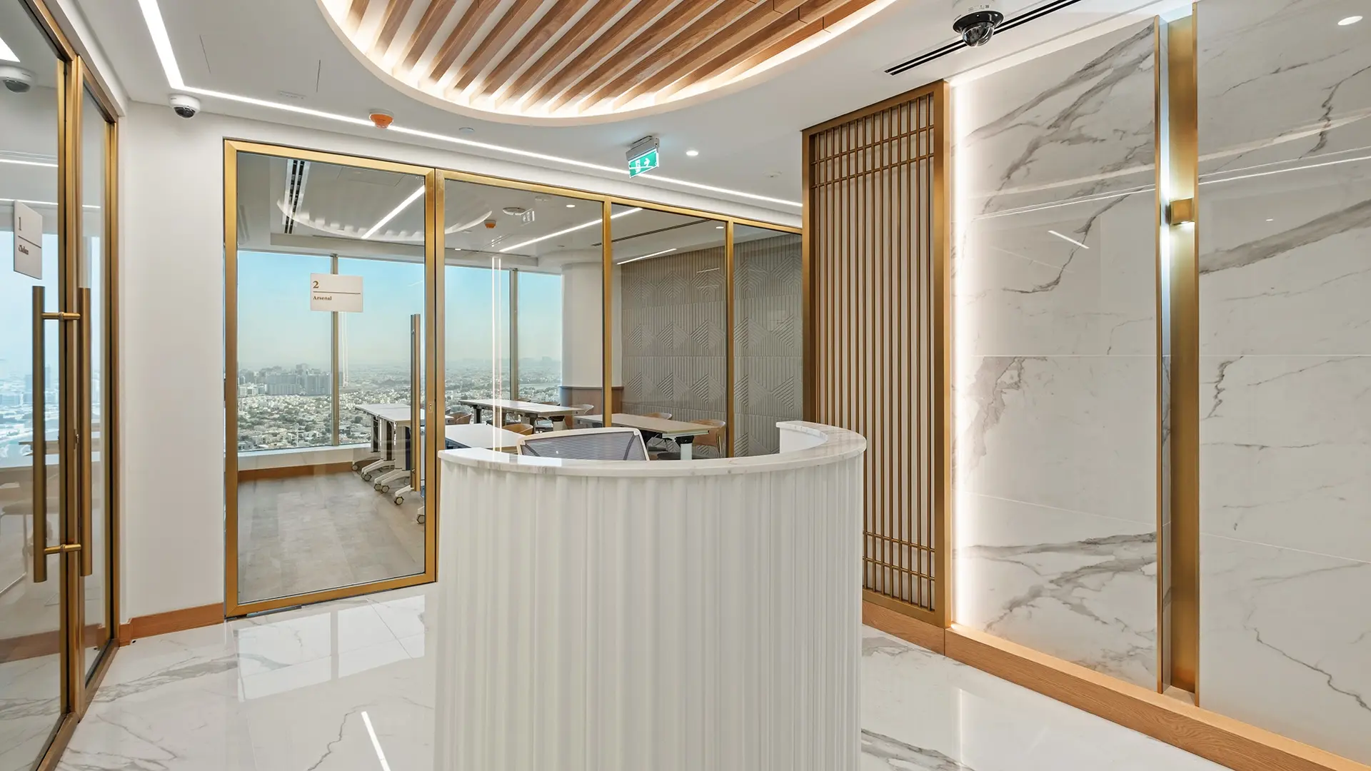 Striking the perfect balance between residential comfort and commercial efficiency, the open-plan office was designed to encourage collaboration while showcasing high-end materials like marble, warm wood, and brass accents. Every element, from inviting communal areas to refined meeting spaces, was created with both aesthetics and durability in mind.